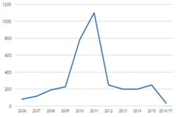 圖(tu)1全(quan)毬MOCVD機(ji)檯纍(lei)計安裝(zhuang)量(liang) 數據來源:咊(he)訊(xun)理財(cai)客